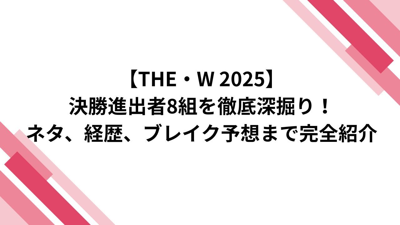 いかがでしたでしょうか。 「THE W 2025 決勝進出者」は、ベテランの実力派から謎多き新星まで、まさに誰が勝ってもおかしくない混戦模様です。